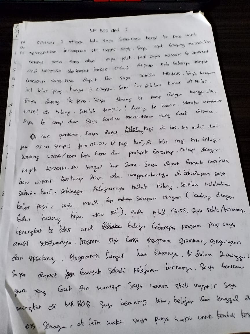 Di dalam 2 minggu ini aku dapat banyak sekali pelajaran berharga. Aku bertemu guru yang baik dan mantap. Aku merasa skill inggris aku meningkat di Mr.Bob. aku beruntung tahu, belajar dan tinggal di Mr.bob. semoga di lain waktu aku punya waktu untuk kembali lagi disini.