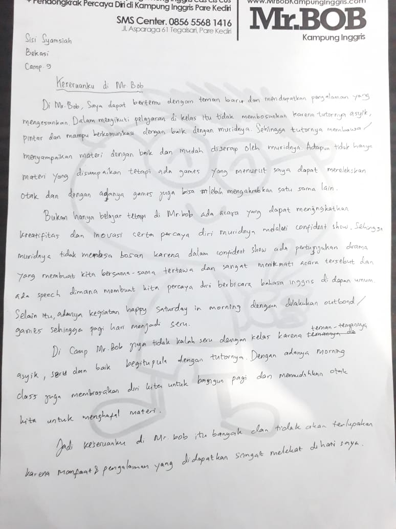 Di camp MR. BOB kampung inggris juga tidak kalah seru dengan kelas karena teman – temannya asyik, seru dan baik begitu pula dengan tutornya, dengan adanya morning class juga membiasakan diri kita untuk bangun pagi dan memudahkan otak kita untuk menghafal materi, jadi keseruanku di MR. BOB kampung inggris itu banyak dan tidak akan terlupakan karena manfaat dan pengalaman yang di dapatkan sangat melekat di hati saya.