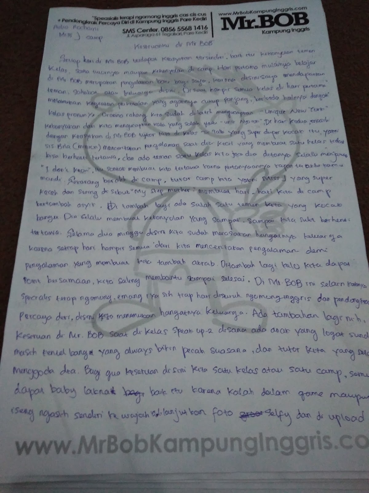 Setiap hari di Mr.BOB Kampung Inggris terdapat keasyikan sendiri. Baik itu kekonyolan temen kelas, sama tutornya maupun kekonyolan di camp. Hari pertama mulainnya belajar di Mr.BOB Kampung inggris merupakan pengalaman baru bagi saya, karena di sini saya mendapatkan teman, sahabat atau keluarga di sini.