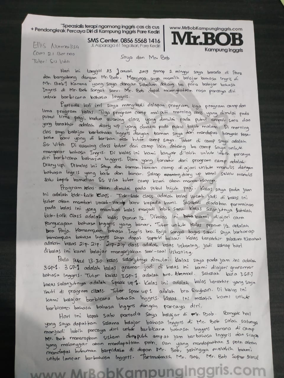 Hari ini tanggal 23 januari 2019 genap 2 minggu aku berada di Pare dan bergabung dengan Mr.BOB kampung inggris. mengapa aku memilih belajar Bahasa inggris di Mr.BOB kampung inggris? Karena yang aku dengar sebelum datang ke Pare belajar Bahasa inggris di Mr.BOB kampung inggris sangat seru. Mr.BOB kampung inggris dapat meningkatkan rasa percaya diri untuk berbicara Bahasa inggris. Periode kali ini aku mengikuti delapan program, tiga program camp dan lima program kelas. Tiga program camp meliputi morning class yang dimulai pada pukul lima pagi, kedua evening class yang dimulai pada pukul empat sore dan yang terakhir adalah diary up yang dimulai pada pukul tujuh malam.