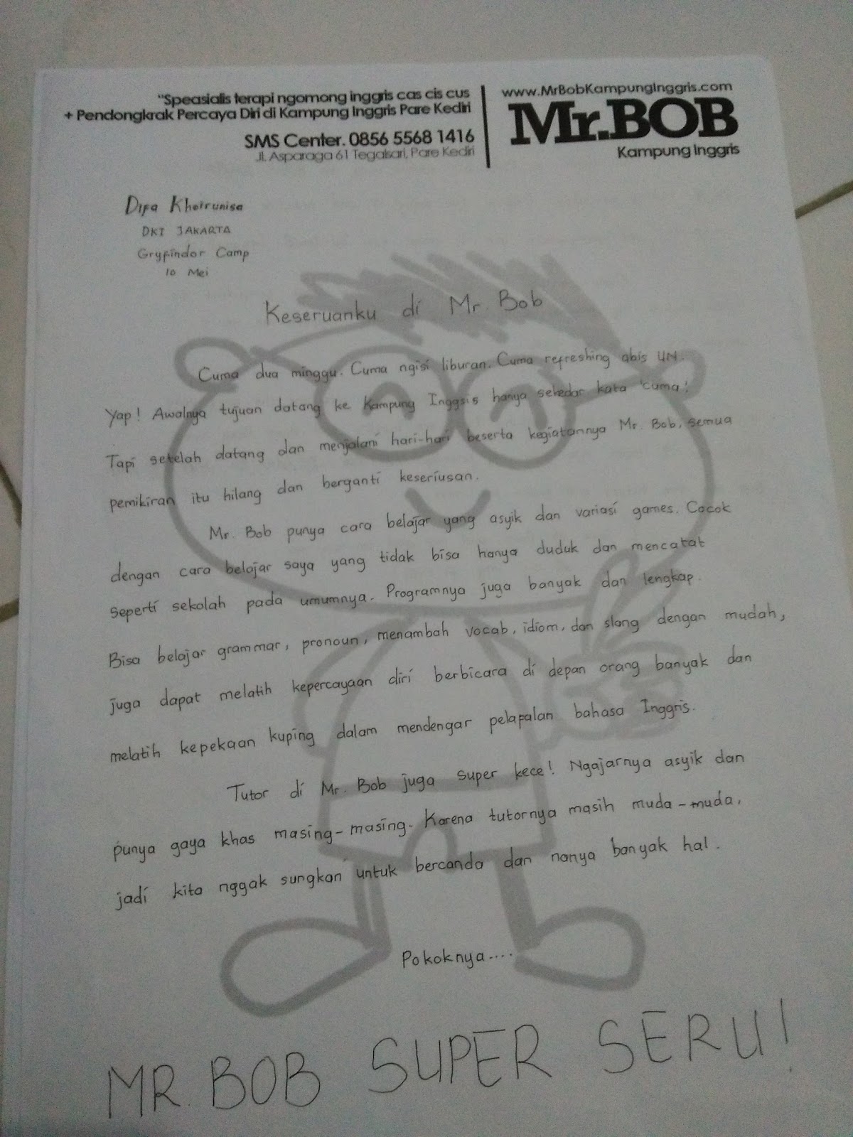 Cuma dua minggu, Cuma ngisi liburan, Cuma refleshing abis UN.. yap ! awalnya tujuan datang ke kampung inggris hanya sekedar kata ‘Cuma’, tapi setelah datang dan menjalani hari-hari beserta kegiatannya Mr.BOB Kampung Inggris, semua pemikiran itu hilang dan berganti keseriusan.