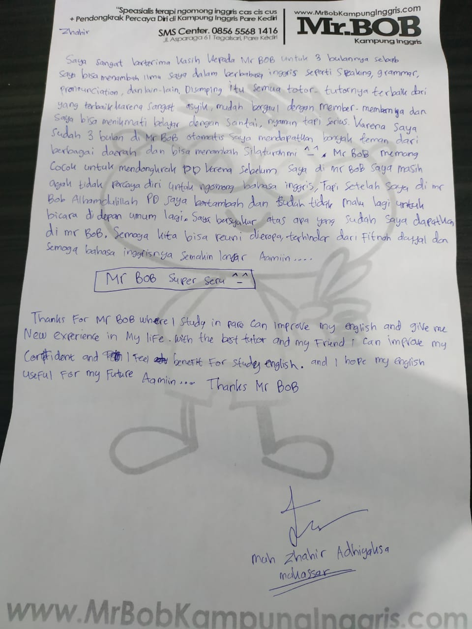 Aku sangat berterima kasih kepada Mr.BOB kampung inggris untuk 3 bulannya sebab aku bisa menambah ilmu aku dalam berbahasa inggris seperti speaking, grammar, pronunciation, dan lain – lain. Disamping itu semua tutor – tutornya terbaik dari yang terbaik karena sangat asyik, mudah bergaul dengan member – membernya dan aku bisa menikmati belajar dengan santai, nyaman tapi serius.