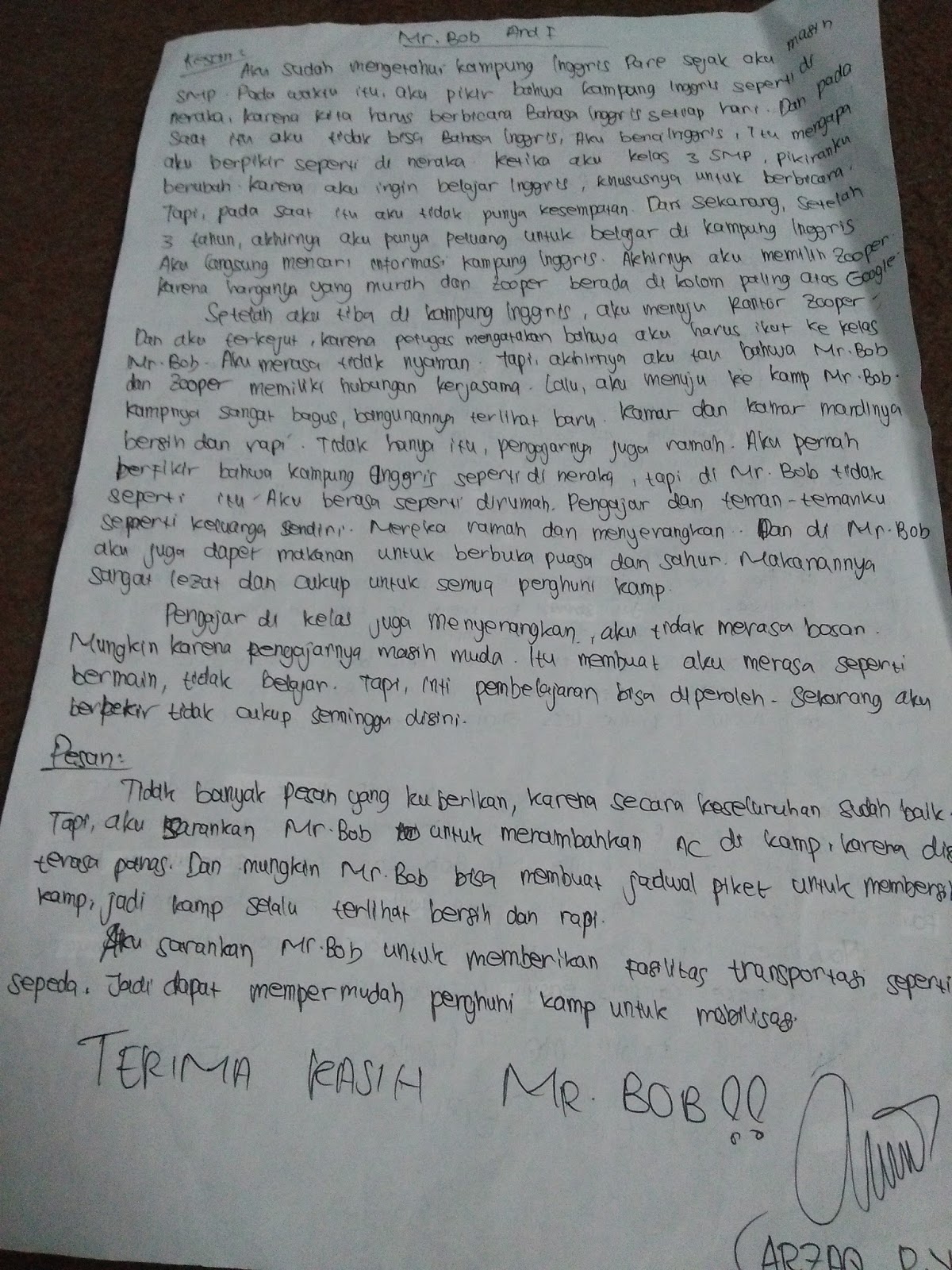Aku sudah mengetahui kampung inggris Pare sejak aku masih SMP. Pada waktu itu, aku pikir bahwa kampung inggris seperti di neraka, karena kita harus berbicara bahasa inggris setiap hari. Dan pada saat itu aku tidak bisa bahasa inggris, aku benci bahasa inggris, itulah mengapa aku berpikir seperti neraka. Ketika aku kelas 3 SMP, pikiranku berubah. Karena aku ingin belajar bahasa inggris, khususnya untuk berbicara, tapi pada saat itu aku tidak punya kesempatan. Dan sekarang, setelah lulus, aku langsung mencari informasi tentang kampung inggris. Akhirnya aku memilih Mr.BOB Kampung Inggris untuk ku belajar.