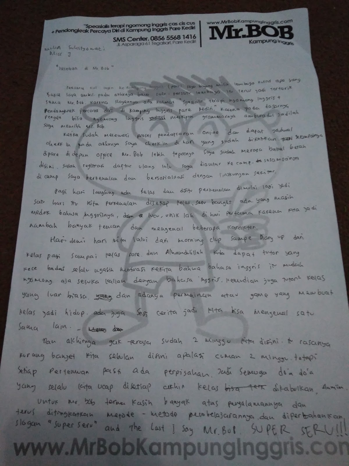 Untuk Mr.BOB Kampung Inggris terima kasih banyak atas pengalamannya dan terus di tingkatkan metode-metode pembelajarannya dan di pertahankan slogannya “Super Seru” and the last i say Mr.BOB SUPERR SERUU !!!!.