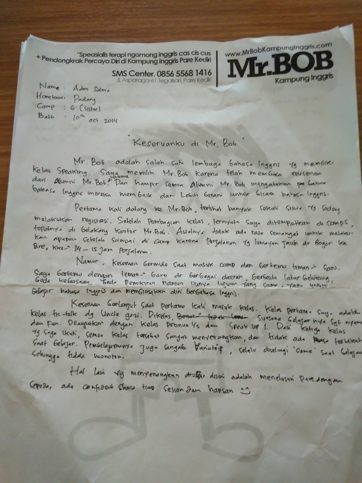 Pertama kali datang di Mr.BOB Kampung Inggris, terlihat banyak sekali siswa yang sedang melakukan registrasi. Setelah pembagian kelas, ternyata aku di tempatkan di camp 6, tepatnya di belakang kantor Mr.BOB Kampung inggris. Awalnya tidak ada rasa semangat untuk melakukan apapun setelah sampai di camp karena perjalanan yang lumayan jauh dari dari bogor ke Pare, kira-kira 14-15 jam perjalanan.