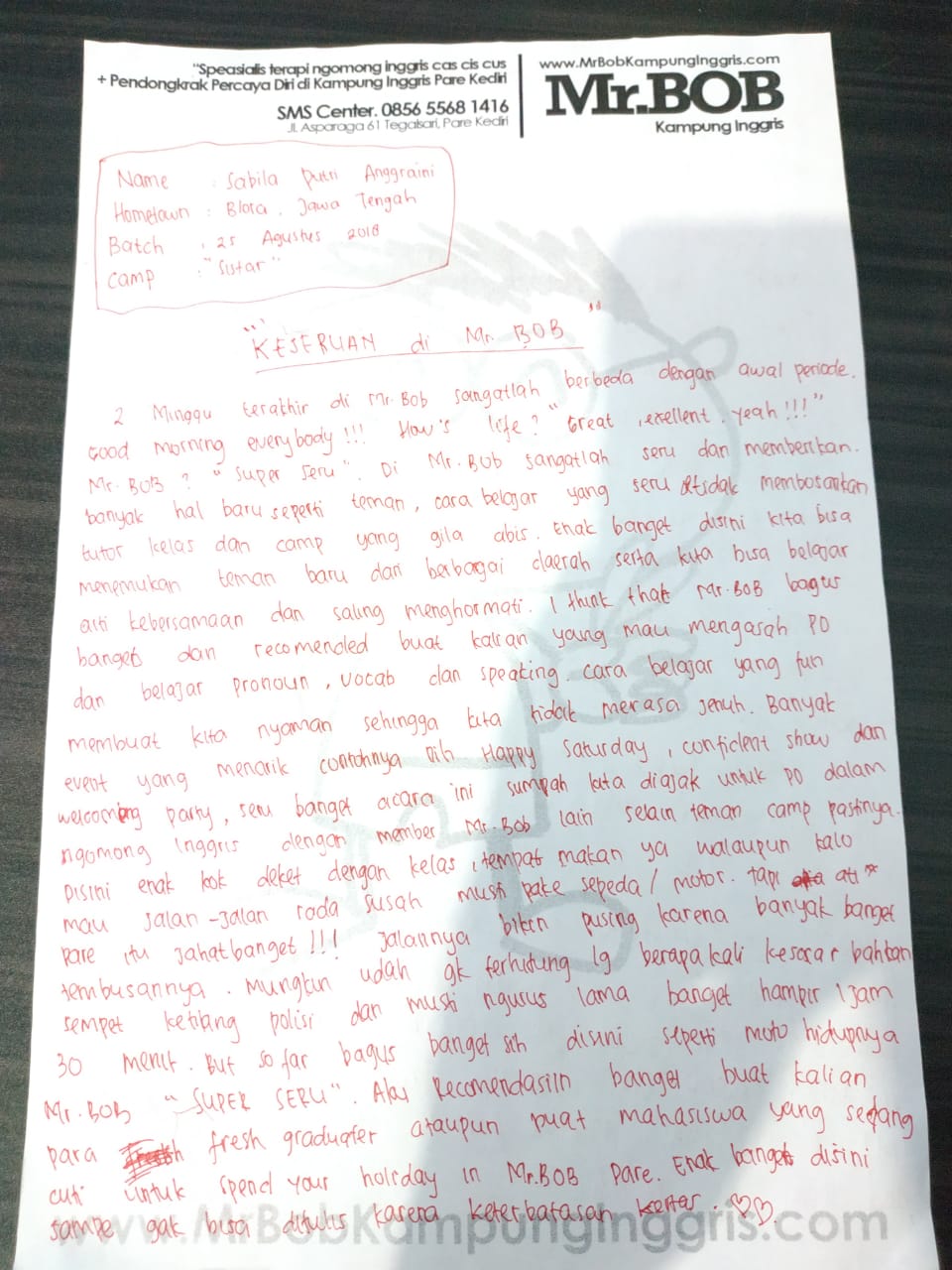 2 minggu terakhir di Mr. Bob kampung inggris sangatlah berbeda dengan awal periode. Good morning everybody!! How’s Life? “Great excellent.. yeah!!” Mr.Bob? “super seru”. Di Mr. Bob kampung inggris sangatlah seru dan memberikan banyak hal baru seperti teman, cara belajar yang seru dan tidak membosankan, tutor kelas dan camp yang gila abisEnak banget disini kita bisa menemukan teman baru dari berbagai daerah serta kita bisa belajar arti kebersamaan dan saling menghormati. I think that Mr. Bob kampung inggris bagus banget dan recommended buat kalian yang mau mengasah PD dan belajar pronun, vocab dan speaking. Cara belajar yang fun membuat kita nyaman sehingga kita tidak merasa jenuh.