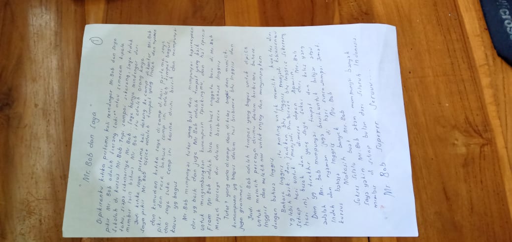 saya datang dengan abangku ke kampung inggris dan langsung daftar di Mr.BOB . aku merasa senang karena apa yang dikatakan abangku adalah benar dan nyata. Mr.BOB itu superseru dan aku merasa nyaman disini. Hal lain yang menjadikan aku senang adalah pembelajaran yang dipakai disini tidak monoton so ngga bakal bosen deh. Ada hal terahir yang buat aku puas, yaitu kelas yang bersih dan nyaman. Sehingga aku bisa belajar dengan fokus dan nyaman. Beberapa minggu disini aku mendapat banyak temen yang seru dan humoris.