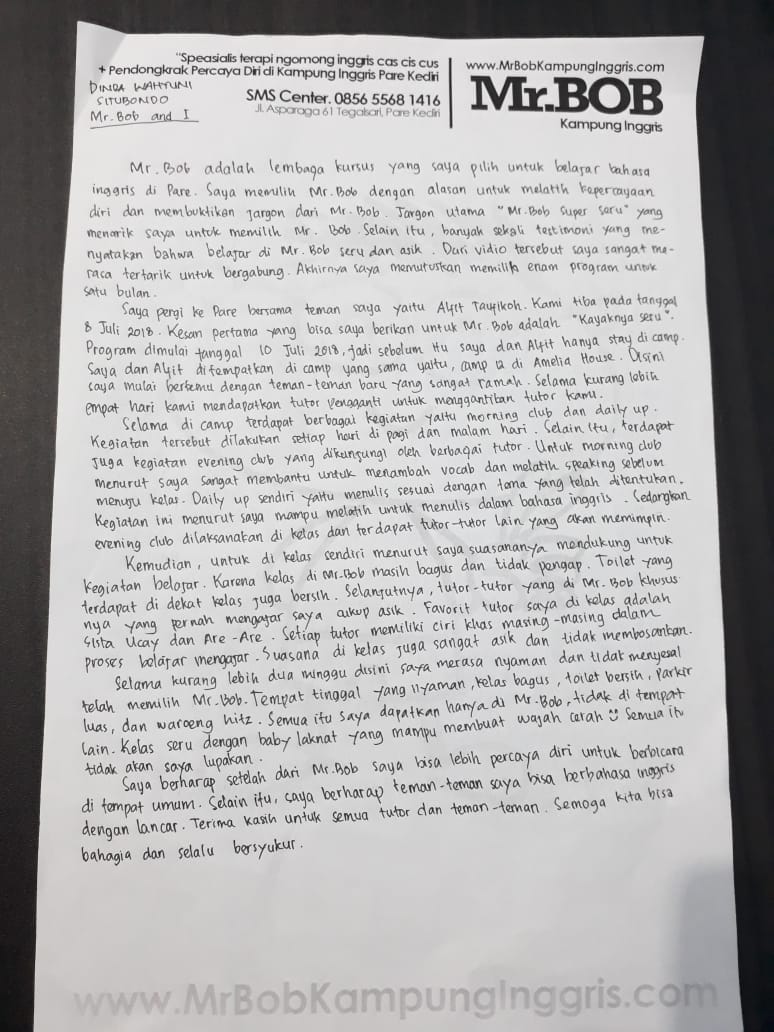 Selama kurang lebih 2 minggu disini aku merasa nyaman dan tidak menyesal telah memiliki Mr. Bob kampug inggris. Tempat tinggal yang nyaman, kelas bagus, toilet bersih, parkir luas dan waroeng hitz. Semua itu aku dapatkan hanya di Mr. Bob kampug inggris, tidak di tempat lain. Kelas seru dengan baby laknat yang mampu membuat wajah cerah. Semua itu tidak akan aku lupakan. Aku berharap setelah dari Mr. Bob kampug inggris aku bisa lebih percaya diri untuk berbicara di tempat umum. Selain itu, Aku berharap teman – teman aku bisa berbahasa inggris dengan lancar. Terima kasih untuk semua tutor dan teman – teman. Semoga kita bisa bahagia dan selalu bersyukur. ^_^
