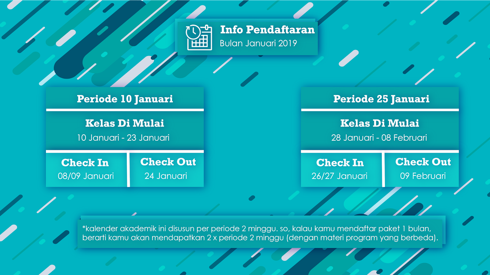 Kalender akademik ini disusun per periode 2 Minggu. So, kalau kamu mendaftar paket 1 bulan, berarti kamu akan mendapatkan 2 x periode 2 minggu (dengan materi program yg berbeda).