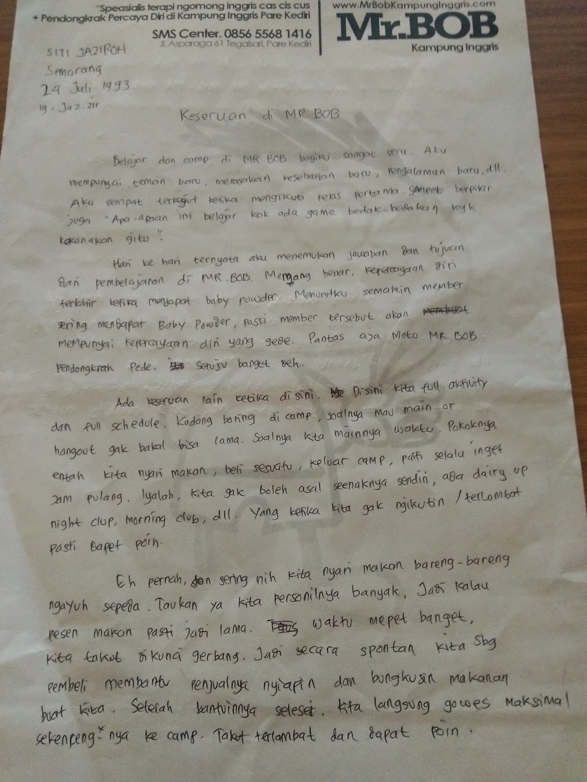 Belajar di camp Mr.BOB kampung Inggris bagiku sangat seru. Aku mempunyai teman baru, merasakan keseharian baru, pengalaman baru, dll. Aku sempat terkejut ketika mengikuti kelas pertama, sampai terpikir juga “ apa-apaan ini belajar kog ada game bedak-bedakan kayak kekanak-anakan gitu ”, begitu awalnya.