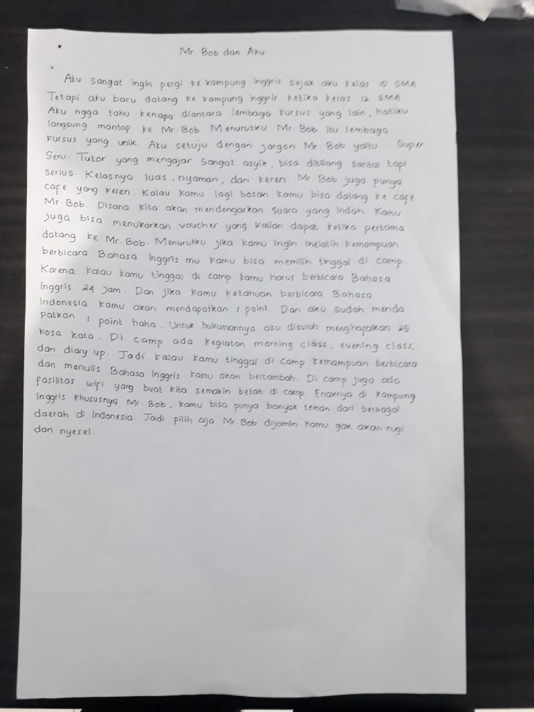 Aku sangat ingin pergi ke kampung inggris sejak aku kelas 10 SMA tetapi aku baru datang ke kampung inggrs ketika kelas 12 SMA, aku ngga tahu kenapa diantara lembaga kursus yang lain, hatiku langsung mantap ke MR. BOB kampung inggris, menurutku MR. BOB kampung inggris itu lembaga kursus yang unik, aku setuju dengan jargon MR. BOB kampung inggris yaitu : “Super Seru”, tutor yang mengajar sangat asyik, bisa dibilang santai tapi serius.Kelasnya luas, nyaman, dan keren.