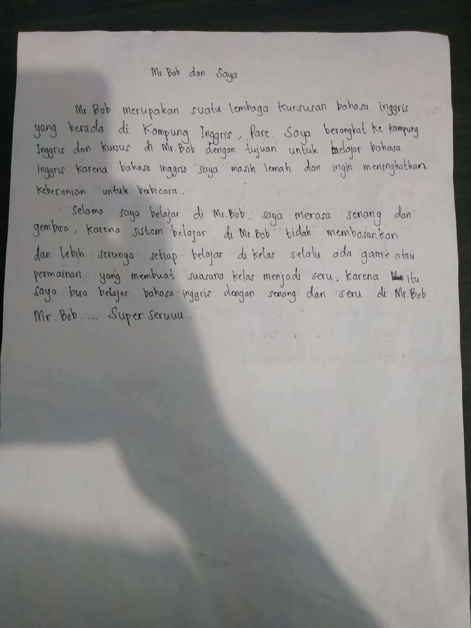 Aku masih lemah dan ingin meningkatkan keberanian untuk berbicara. Selama aku belajar di Mr.Bob kampung inggris, aku merasa senang dan gembira, karena sistem belajar di Mr.Bob kampung inggris tidak membosankan.