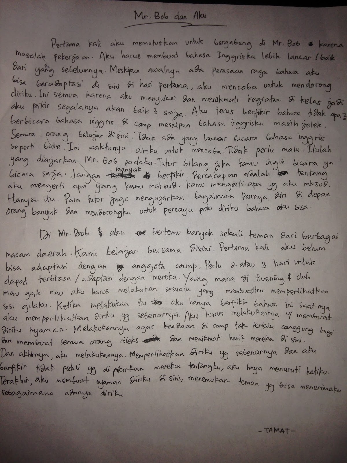 Di Mr.BOB Kampung Inggris aku bertemu banyak sekali teman dari berbagai macam daerah. Kami belajar bersama di sini. Pertama kali aku belum bisa beradaptasi dengan anggota camp. Perlu 2 atau 3 hari untuk dapat terbiasa/adaptasi dengan mereka. Yang mana di evening club mau gak mau aku harus melakukan itu aku hanya berpikir bahwa ini saatnya aku memperlihatkan diriku yang sebenarnya. Aku harus melakukannya untuk untuk membuat diriku nyaman. Melakukannya agar keadaan di camp tak terlalu canggung lagi dan membuat semua orang rileks dan menikmati hari-hari mereka di sini. Dan akhirnya, aku melakukannya. Memperlihatkan diriku yang sebenarnya dan aku berpikir tidak peduli yang di pikirkan mereka tentangku, aku hanya menuruti hatiku. Terakhir, aku membuat nyaman diriku di sini, menemukan teman yang bisa menerimaku sebagaimana adanya diriku.