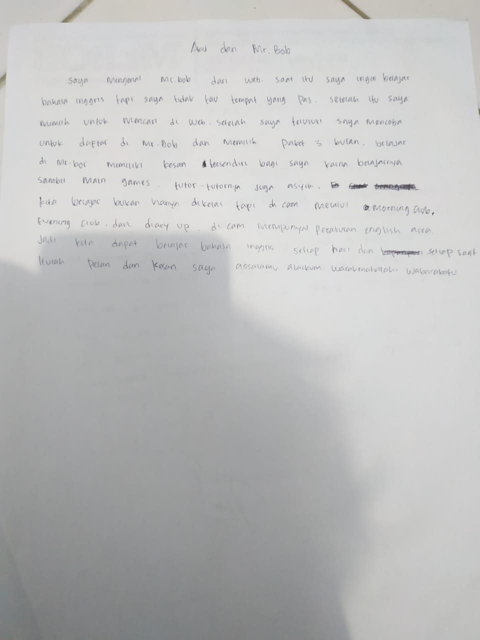 Aku mengenal Mr.Bob kampung inggris dari web saat itu aku ingin belajar inggris tapi aku tidak tau tempat yang pas, setelah itu aku telusuri aku mencoba untuk daftar di Mr.Bob kampung inggris dan memilih paket 3 bulan. Belajar sambil main games.