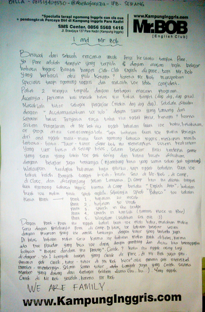 Berawal dari sebuah rencana untuk pergi ke suatu tempat, Pare. Ya pare adalah tempat yang terpilih dengan alasan ingin belajar bahasa inggris. Banyak banget club – club english di Pare, tapi Mr.Bob yang berhasil aku pilih, kenapa?? Karena Mr.Bob merupakan specialis terapi ngomong Inggris dan melatih loe lebih confident (PD).