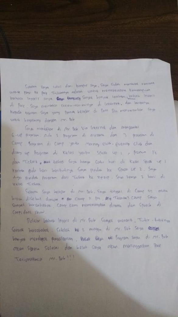 Setelah aku lulus dari perguruan tinggi aku, aku telah membuat rencana untuk pergi ke Pare. Tujuanku untuk meningkatkan keterampilan bahasa Inggrisku. Ada banyak lembaga kursus bahasa Inggris di Pare. Aku membaca ulasan di internet dan aku bertanya kepada teman-teman aku yang pernah belajar di Pare. Dia menyarankan aku untuk bergabung dengan Mr.Bob Kampung Inggris. Aku mendaftar di Mr.Bob melalui internet dan mengambil 6 program. ada 3 program di camp. Programnya adalah Morning Club, Evening Club, dan Diary Up.