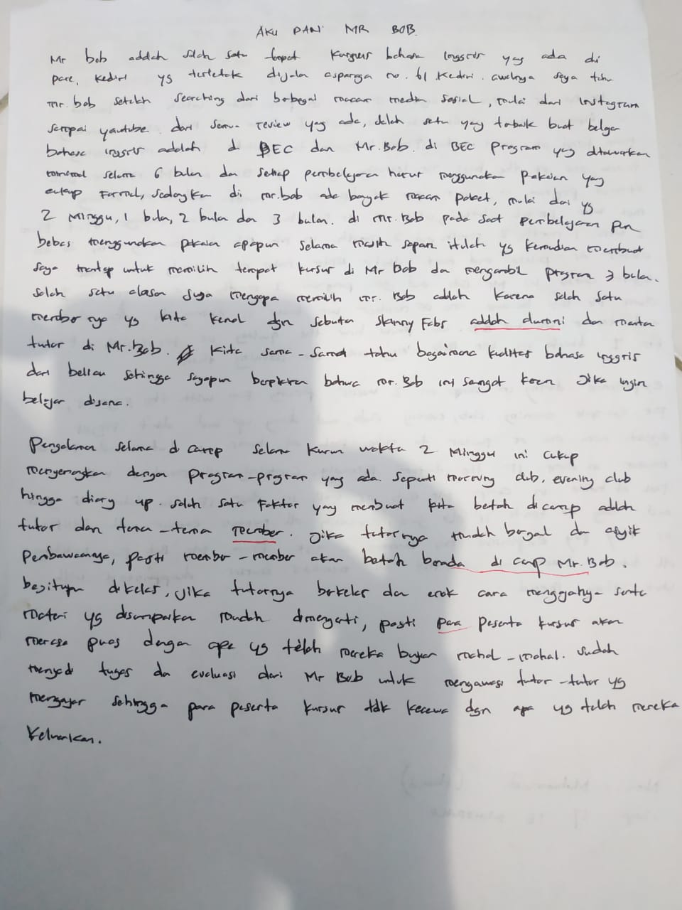 Mr.Bob kampung inggris adalah salah satu tempat kursus bahasa inggris yang ada di pare, kediri yang terletak di jln asparaga no. 61 kediri. Awalnya aku tau Mr.Bob kampung inggris setelah searching dari berbagai macam media sosial, mulai dari instagram sampai youtube. Dari semua review yang ada, salah satu yang terbaik adalah di Mr.bob kampung inggris dan BEC kampung inggris. Di Mr.Bob kampung inggris pada saat pembelajaranpun bebas menggunakan pakaian apapun selama masih sopan itulah yang kemudian membuat aku mantap untuk memilih tempat kursus di Mr.Bob kampung inggris dan aku mengambil program 3 bulan.