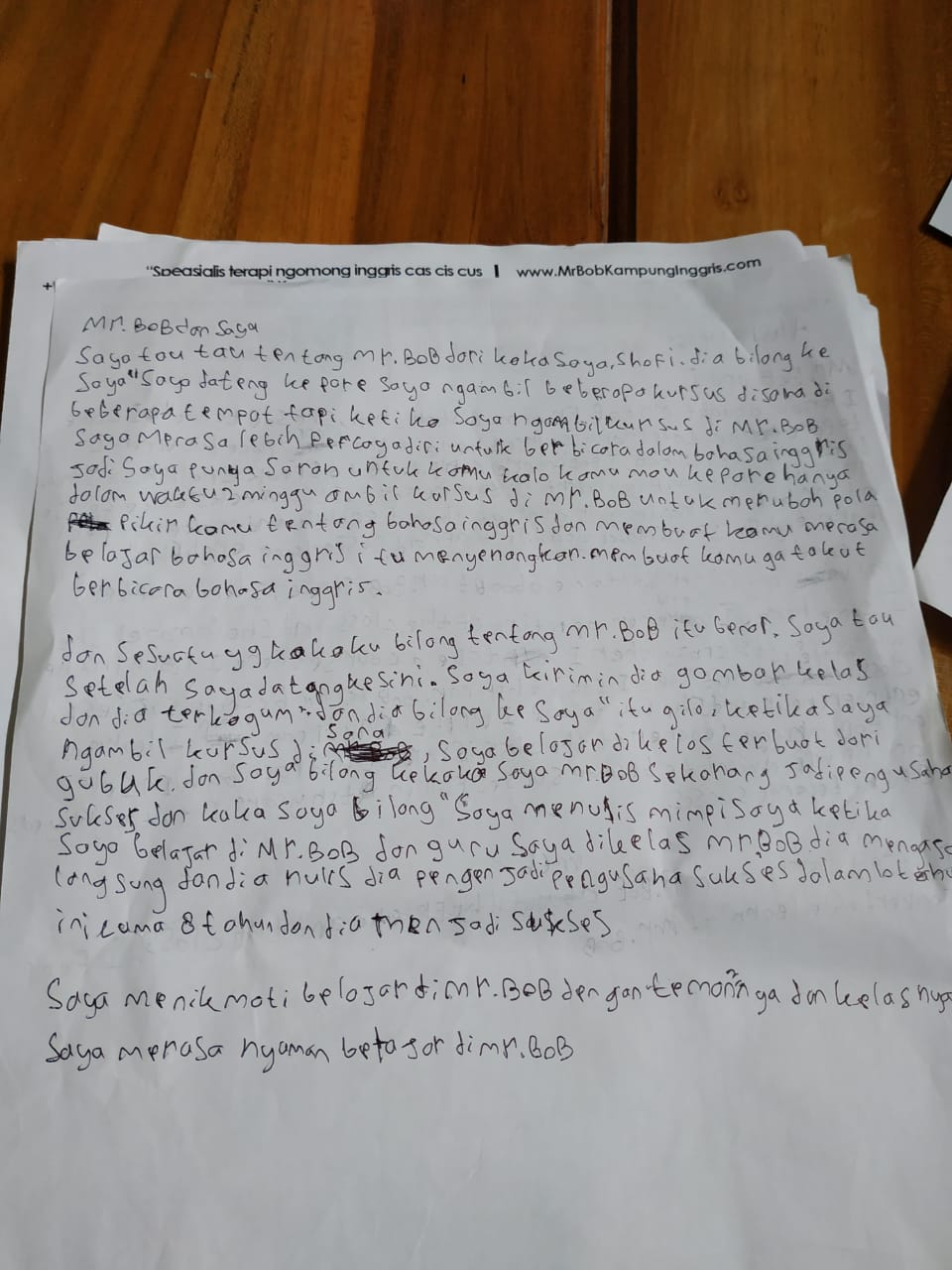 Dan sesuatu yang kaku bilang tentang Mr.Bob itu benar. Saya tau setelah saya datang kesini. Saya kirimin dia gambar kelas dan dia terkagum-kagum dan dia bilang ke saya “itu gila, ketika saya mengambil kursus disana , saya belajar dikelas terbuat dari gubuk, dan saya bilang “saya menulis mimpi saya ketika saya belajar di Mr.Bob dan guru saya di kelas Mr.Bob dia mengajar langsung dan dia pengen jadi pengusaha sukses dalam tahun ini lama 8 tahun dia menjadi sukses.