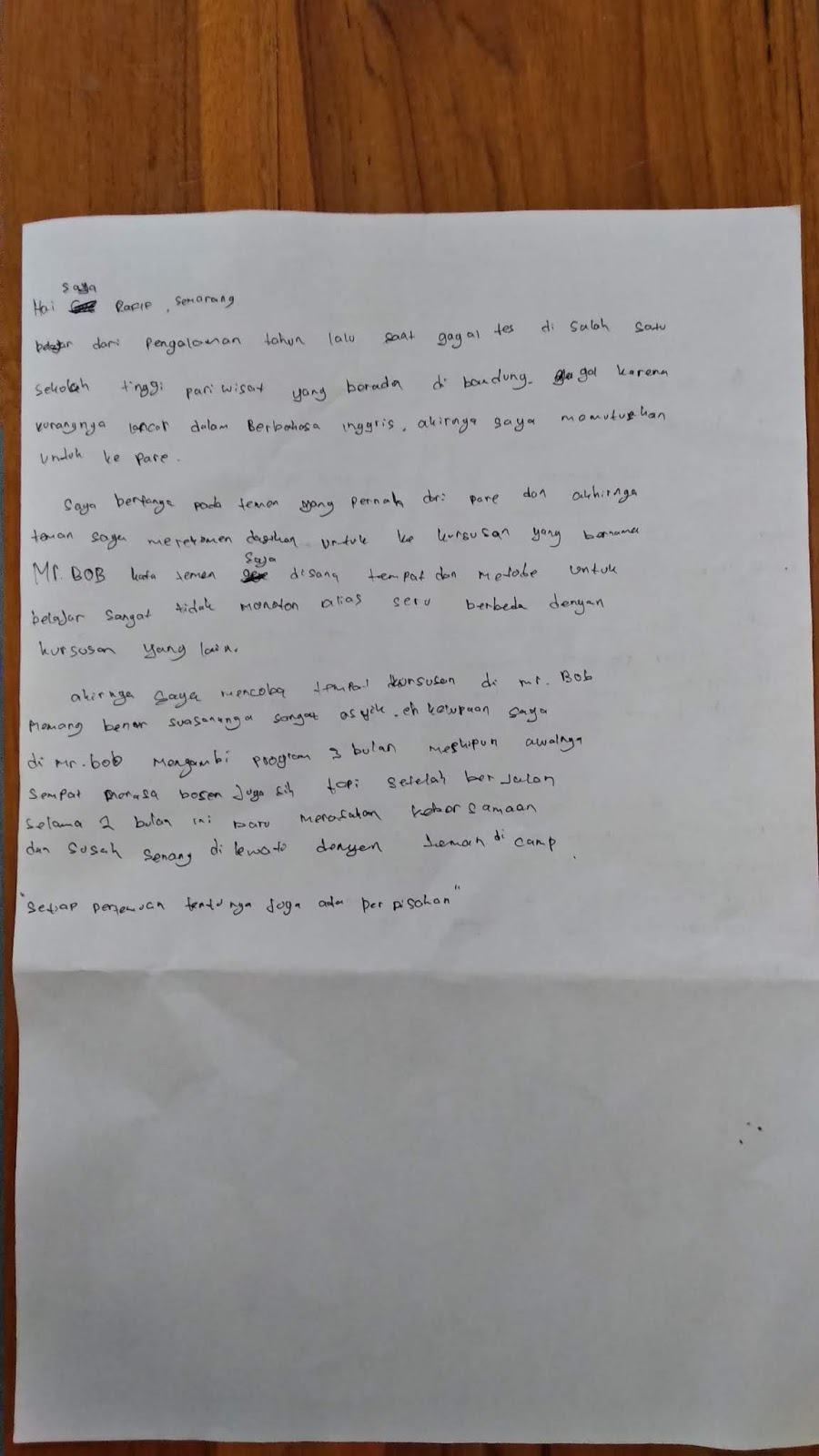 Hai, saya Rafif dari Semarang. Belajar dari pengalaman tahun lalu saat gagal tes di salah satu sekolah tinggi pariwisata yang berada di Bandung. Saya gagal karena kurang lancarnya dalam berbahasa Inggris, akhirnya saya memutuskan untuk ke Kampung Inggris di Pare.