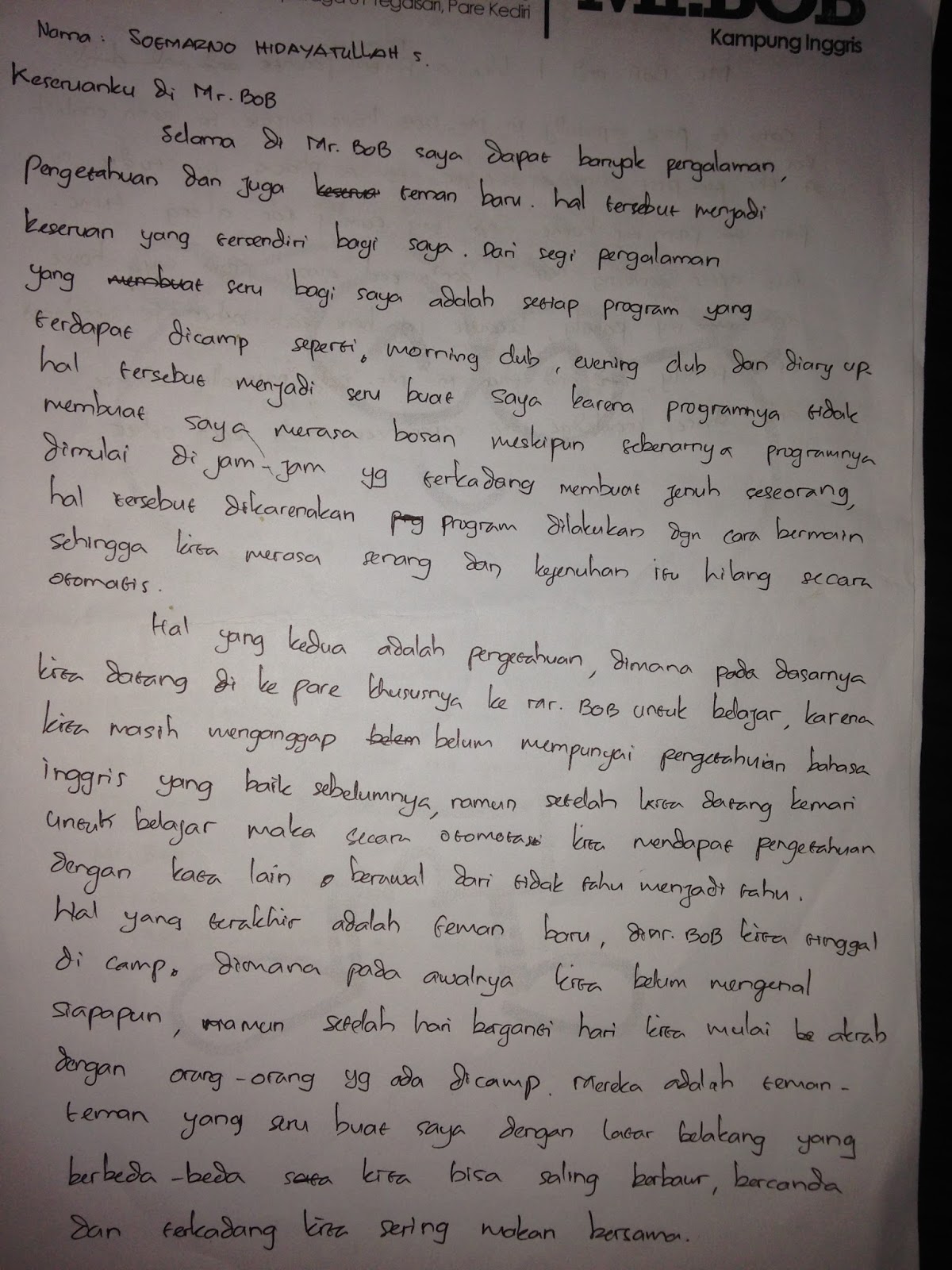 Selama di Mr.BOB Kampung Inggris aku dapat banyak pengalaman, pengetahuan dan juga teman baru. Hal tersebut menjadi keseruan yang tersendiri bagi aku. Dari segi pengalaman yang seru bagi aku adalah setiap program yang terdapat di camp seperti morning club, evening club dan diary up. Hal tersebut menjadi seru buat aku karena programya tidak membuat aku bosan meskipun sebenarnya programnya di mulai di jam-jam yang terkadang membuat jenuh seseorang, hal tersebut di karenakan program di lakukan dengan cara bermain sehingga kita merasa senang dan kejenuhan itu hilang secara otomatis.