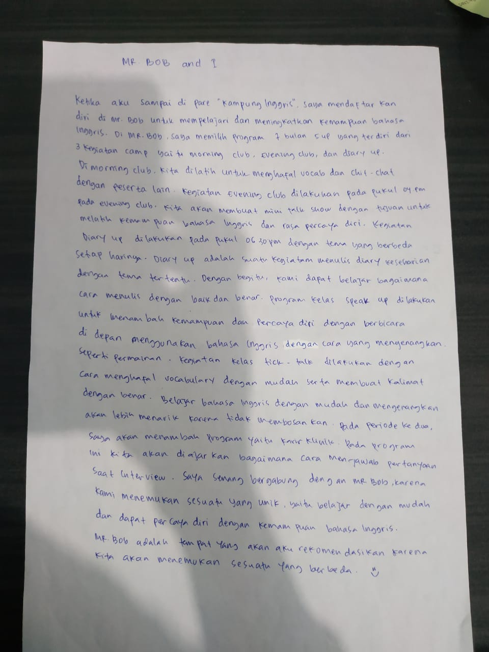 Ketika aku sampai di Pare “Kampung Inggris”. Aku mendaftarkan diri di Mr.BOB kampung inggris untuk mempelajari dan meningkatkan kemampuan Bahasa inggris. Di Mr.BOB kampung inggris, aku memilih program 7 bulan 5 up yang terdiri dari 3 kegiatan camp yaitu morning club, evening club, dan diary up. Di morning club, kita dilatih untuk menghafal vocab dan chit –chat dengan peserta lain. Kegiatan evening club dilakukan pada pukul 04.00 P.m. pada evening club, kita akan membuat mini talk show dengan tujuan untuk melatih kemampuan Bahasa inggris dan percaya diri.kegiatan diary up dilakukan pada pukul 06.30 P.m dengan tema yang berbeda setiap harinya.