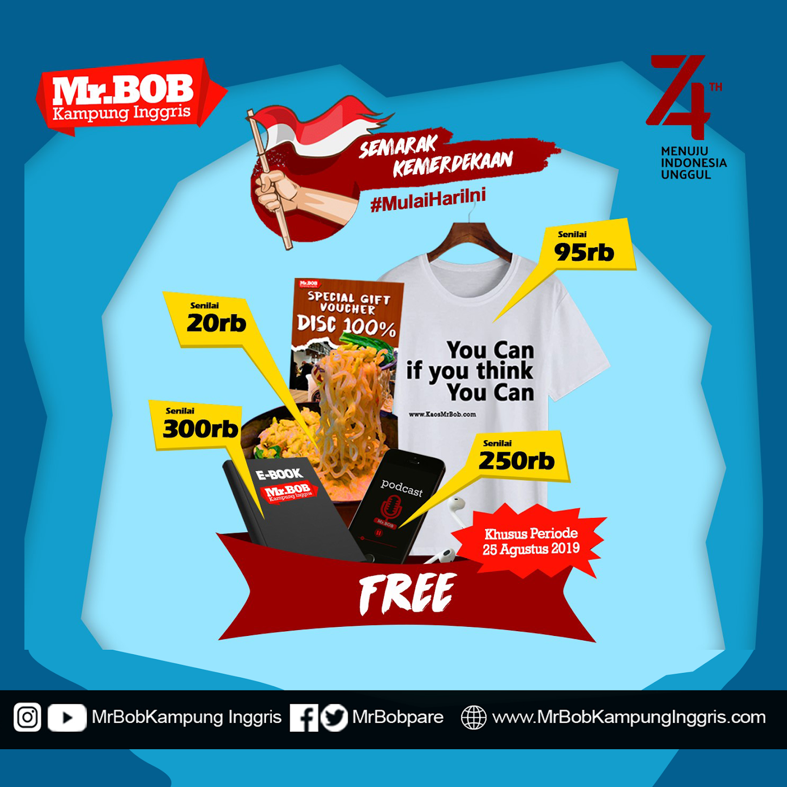 Spesial untuk memeriahkan HUT kemerdekaan RI yang ke-74, kali ini Mr.BOB Kampung Inggris mengadakan promo besar-besaran loh. Sebagai bentuk rasa syukur kami yang telah menjadi salah satu lembaga terbesar dan terbaik di Kampung Inggris, Pare, Kediri. Kami ingin memberikan spesial bonus untuk kamu yang mendaftar di periode 25 Agustus 2019. Bonus ini pun tidak main-main akan ada 4 jenis bonus yang akan kami berikan secara GRATIS!!.. yaitu ….