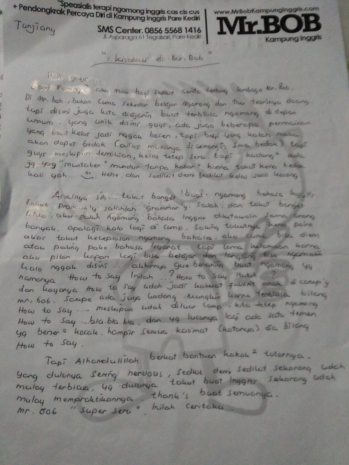 Good morning ? aku mau berbagi sedikit cerita tentang lembaga Mr.BOB Kampung Inggris. Di Mr.BOB, bukan Cuma sekedar belajar ngomong belajar ngomong dan tau teorinya doang. Tapi di sini juga di ajari baut terbiasa ngomong di depan umum. Yang unik di sini guys, tapi bagi yang kalah maka akan dapat bedak ( alias mukanya di lemongin sama bedak ), tapi guys meskipun demikian, kelas tetap seru.