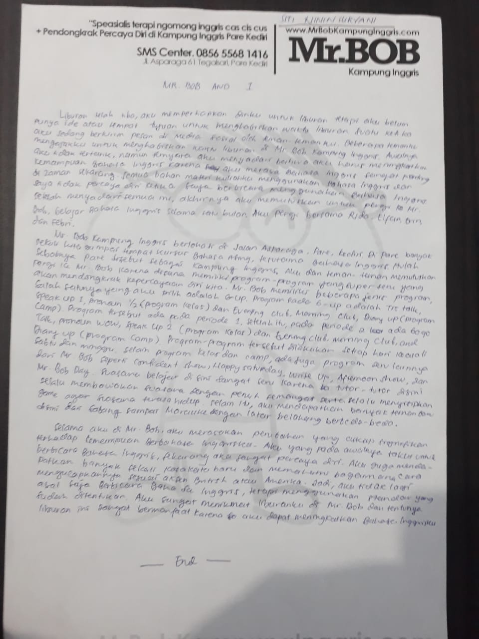 Selama aku di Mr. Bob kampung inggris aku merasakan perubahan yang cukup signifikan terhadap kemampuan berbahasa inggrisku, aku yang pada awalnya takut untuk berbicara bahasa inggris, sekarang aku sangat percaya diri, aku juga mendapatkan banyak sekali kosakata baru dan memahami bagaimana cara mengucapkannya sesuai aksen british atau american. Jadi, aku tidak lagi asal saja berbicara bahasa inggris, tetapi menggunakan standar yang sudah ditentukan, aku sangat menikmati liburanku di Mr. Bob kampung inggris dan tentunya liburan ini sangat bermanfaat karena aku dapat meningkatkan bahasa inggrisku. ^_^