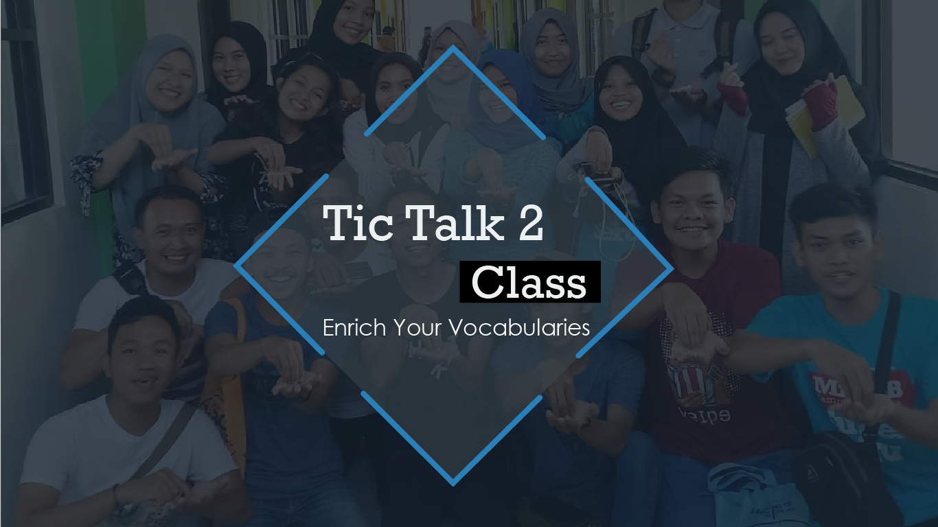 Tic – Talk 2 Class merupakan salah satu kelas di Mr.BOB kampung inggris, dan lebih sering kita kenal dengan “Vocabulary Class” . Kelas ini termasuk kelas lanjutan dari Tic Talk Class ya guys, jadi kelas ini pas buat temen – temen yang pengen ningkatin serta nambah pengetahuan lebih tentang vocabulary.
